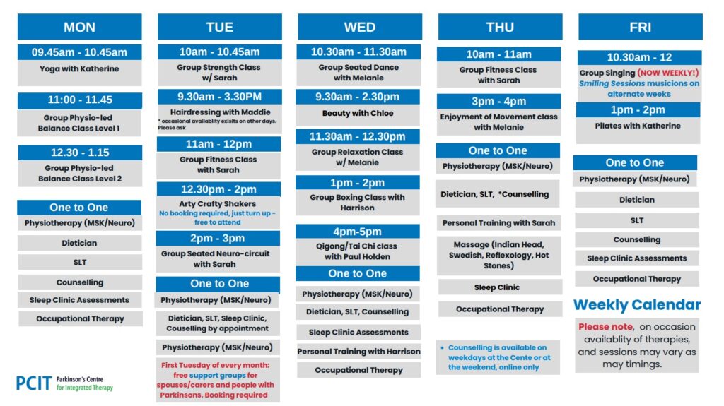 Discover our full schedule of group classes, workshops, and activities; carefully designed to support the wellbeing of people with Parkinson’s and their carers every week.